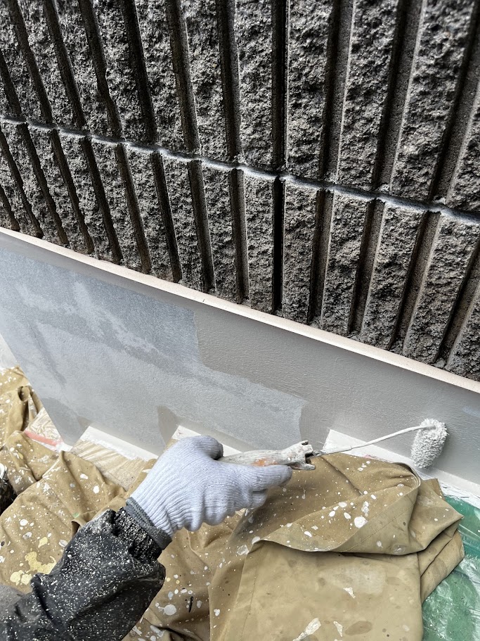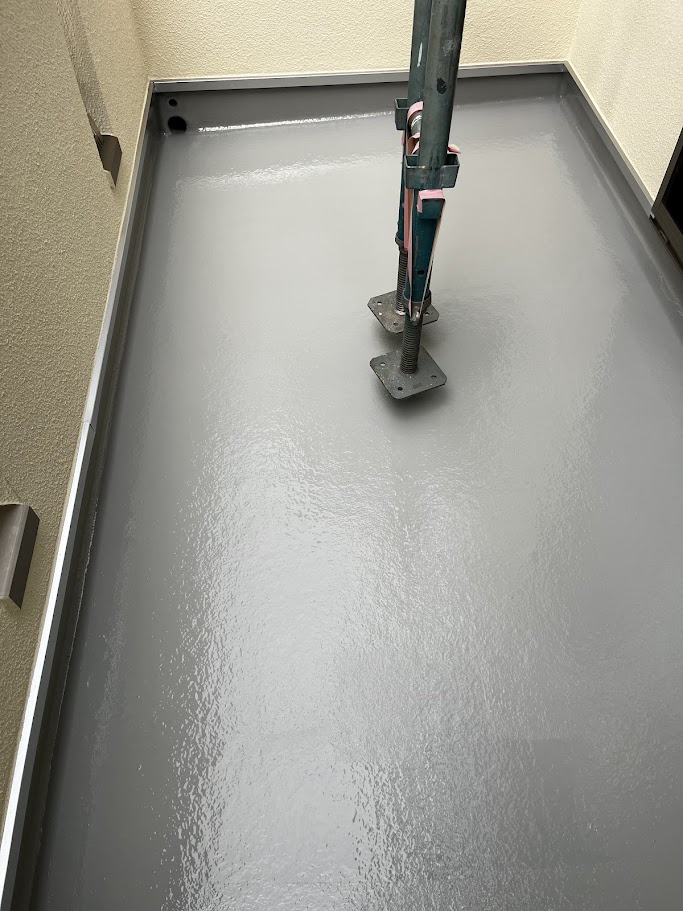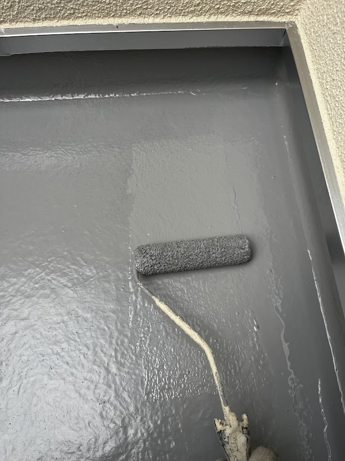 まずはベランダの防水から。今回は高い耐久性が特長のオートンウレアックスHGをトップコートとして施工しました。ベランダは紫外線や雨の影響をダイレクトに受ける場所なので、防水層そのものだけでなく「表面を守るトップコート」がとても重要です。 トップコートは防水層を紫外線から守り、劣化のスピードを抑える役割があります。表面の保護が弱くなると、せっかくの防水層も傷みやすくなり、ひび割れや膨れ、最悪の場合は雨漏りにつながってしまうことも。だからこそ、見えにくい場所でも手を抜けません。