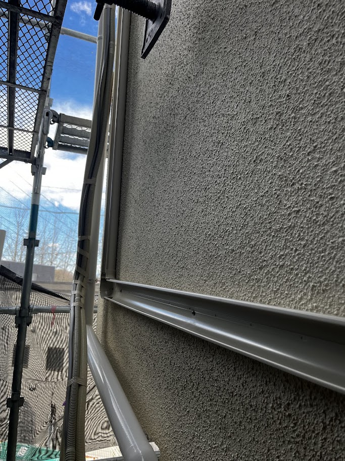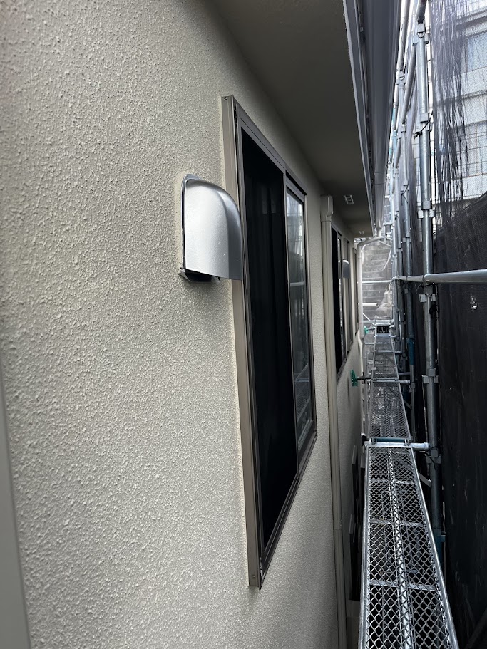 そして今回、こだわったポイントのひとつがエアコンの配管カバーです。塗装工事では、見える部分だけ塗って終わりにしてしまうと、後々「そこだけ劣化が早い」「汚れ筋が出る」「色がまだらに見える」などの原因になることがあります。 配管カバーが付いたままだと、カバーの裏側の壁が塗れません。つまり、外観はきれいになっても、カバーの裏だけは“手付かず”の状態が残ってしまうんです。そこは雨や湿気がこもりやすく、劣化が進みやすいポイントでもあります。 そこで今回は、配管カバーを一度取り外して、裏側の壁までしっかり塗装。塗り残しをなくして、壁全体の保護性能を揃えたうえで、位置や納まりを確認しながら丁寧に取り付け直しました。 見た目のスッキリ感はもちろんですが、こうした“外して塗る”ひと手間が、長い目で見たときの耐久性や見栄えに効いてきます。外装がきれいになったのに、付帯部まわりだけ古いままだとどうしても違和感が出てしまうので、最後の仕上げで全体の統一感を整えています。