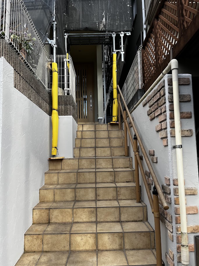 次に、玄関までの階段まわりの壁。こちらは無機塗料のランデックスコートP-5000で仕上げました。階段まわりは毎日目に入る場所なので、ここがきれいにまとまると家全体の印象がグッと良くなります。 ランデックスコートP-5000は、落ち着いた質感で仕上がりが上品に見えるのが特徴です。汚れが付きにくい塗料でもあるので、人の出入りが多い玄関まわりに相性が良いと感じます。見切り部分や境目のラインがヨレないように、細かな納まりを整えながら仕上げました。 塗装は「広い面」よりも、「端部」「境目」「取り合い」といった細部で腕が出ます。サッシまわり、タイルの見切り、各パーツの境界線など、最後に養生を外したときにラインがビシッと決まっていると気持ちがいいですね。こういった仕上げの積み重ねが、完成時の“清潔感”や“丁寧さ”として伝わります。