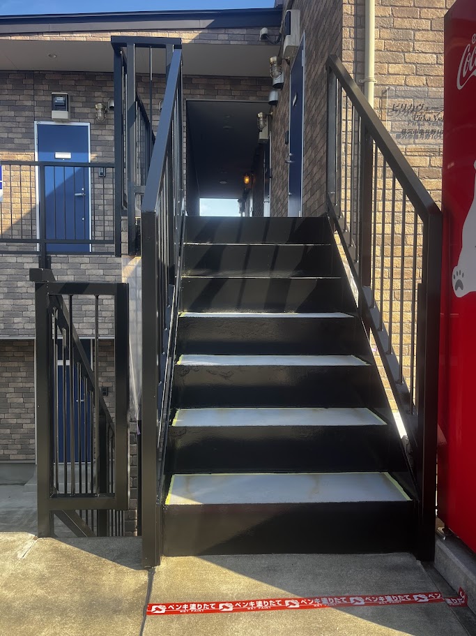 下地処理→錆止め→上塗りの順で施工し、鉄骨階段がきれいに仕上がりました。 鉄部は放置すると腐食が進むので、早めのメンテナンスがおすすめです。