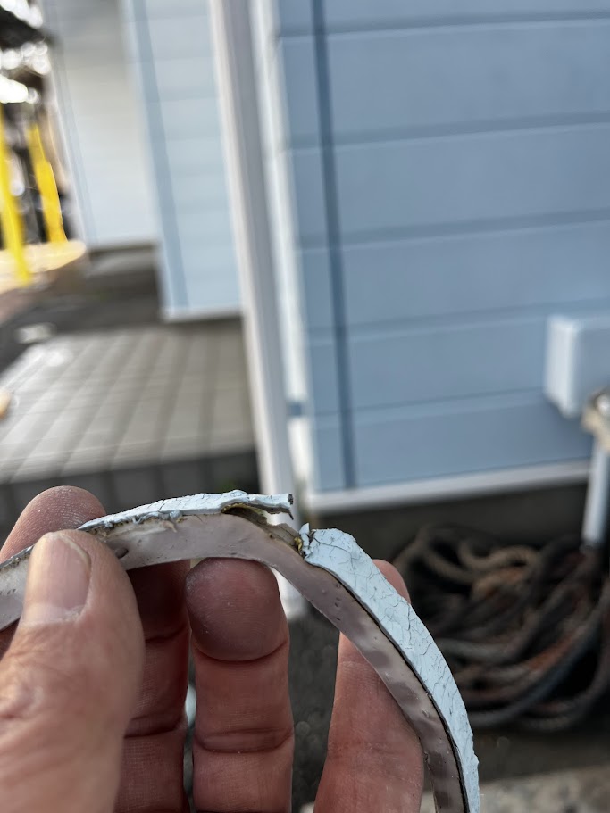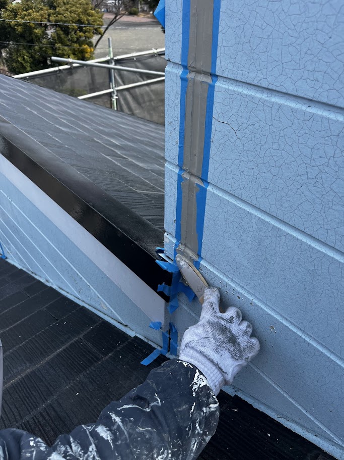今回の工事で特に大切にしたポイントの一つが、シーリング工事です。 前回の施工では、縦目地のシーリングが増し打ちされていたようでした。増し打ちは既存のシーリングの上から新しい材料を重ねる方法ですが、既存部分の劣化が残ったままになることがあり、長期的に見ると不安が残るケースもあります。 そこで今回は、既存のシーリングをしっかり撤去し、新しく打ち替えを行いました。 手間は増えますが、古いシーリングを残さずに打ち替えることで、密着性や防水性の面でも安心感が変わってきます。特にサイディング外壁では、目地の状態が建物の耐久性に直結するため、この工程はとても大切です。